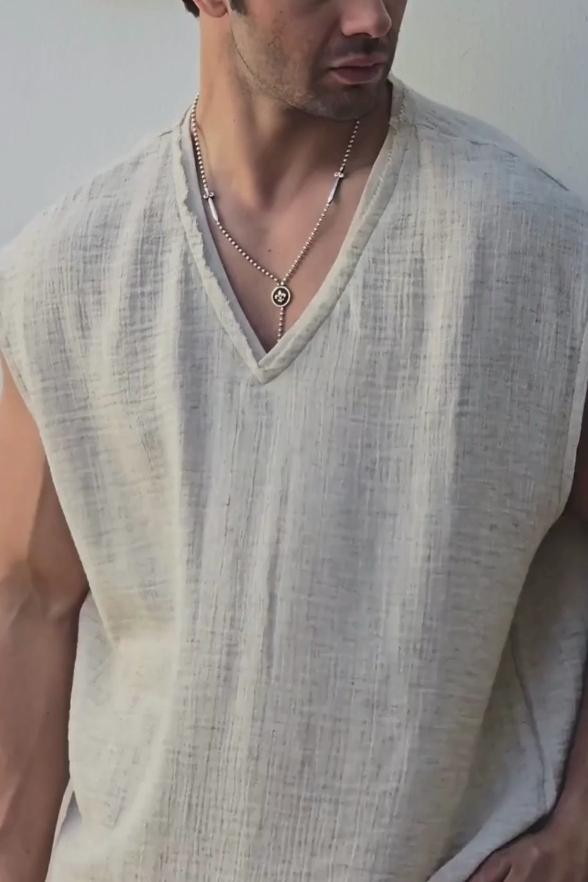 The raw neck detail adds a touch of rugged sophistication, setting it apart from ordinary shirts. With a sleeveless, oversize fit, this shirt offers unmatched comfort and casual elegance. Ideal for hot summer days, casual outings, and travel, it adapts effortlessly to various occasions, including music festivals and night outs. This versatile piece is a must-have for men who appreciate sustainable fashion and superior comfort.