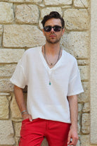The PELEUS White Organic Double Gauze Cotton Shirt is a refined alternative to the classic jersey tee — crafted for men who want comfort that breathes. Made from 100% organic cotton double gauze, this shirt is naturally soft, airy, and kind to the skin — the perfect choice for hot, humid days when regular T-shirts trap the heat.