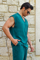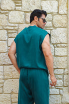 The Raven Shirt in Teal merges quiet sophistication with conscious design. Made from a fine blend of cupro —often called vegan silk— and Ecovero™ viscose, it offers the fluid drape of silk with the ease of breathable cotton. The sleeveless, button-free silhouette, subtle stone-washed finish, and naturally cool touch make it a timeless staple for those who value both comfort and presence.