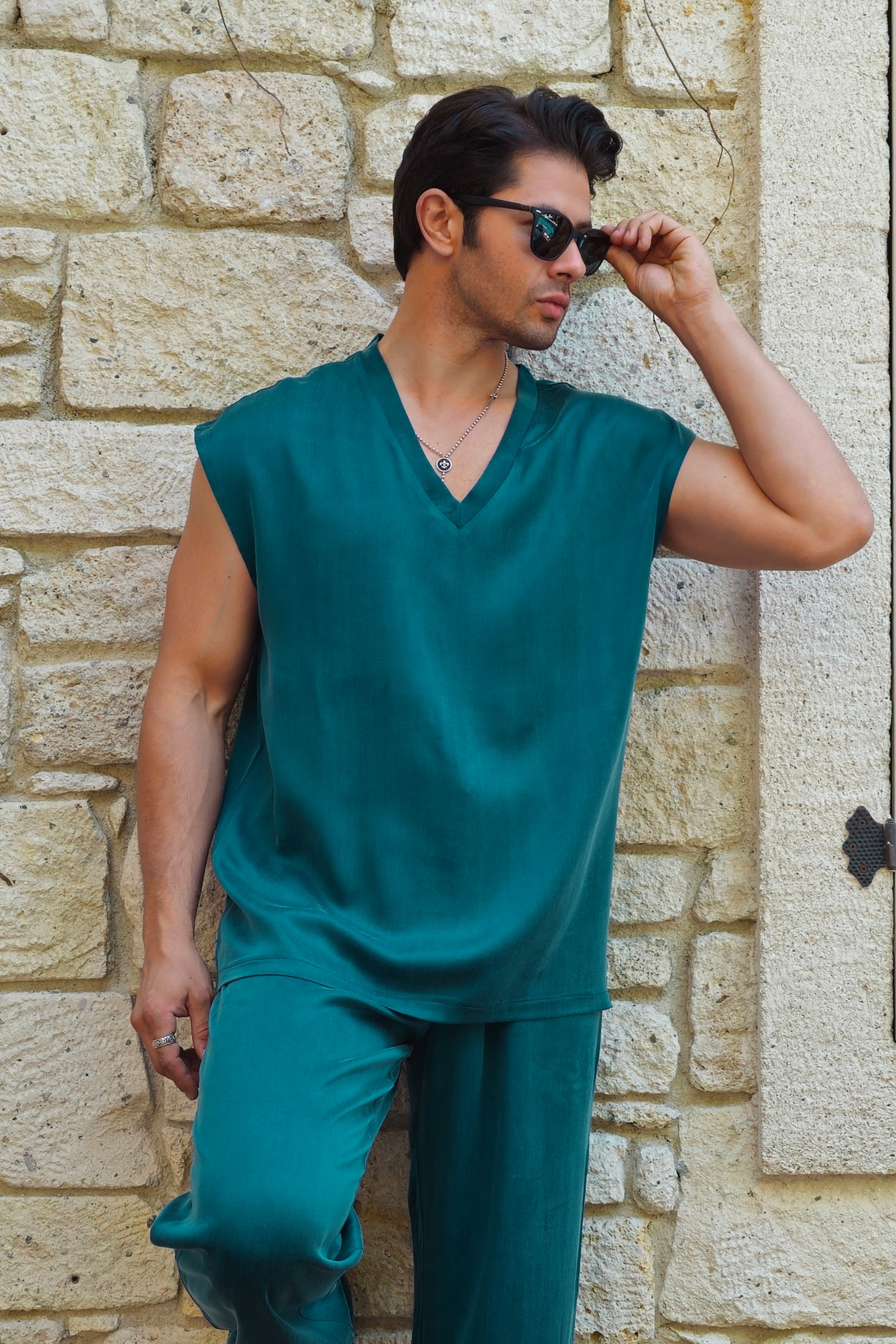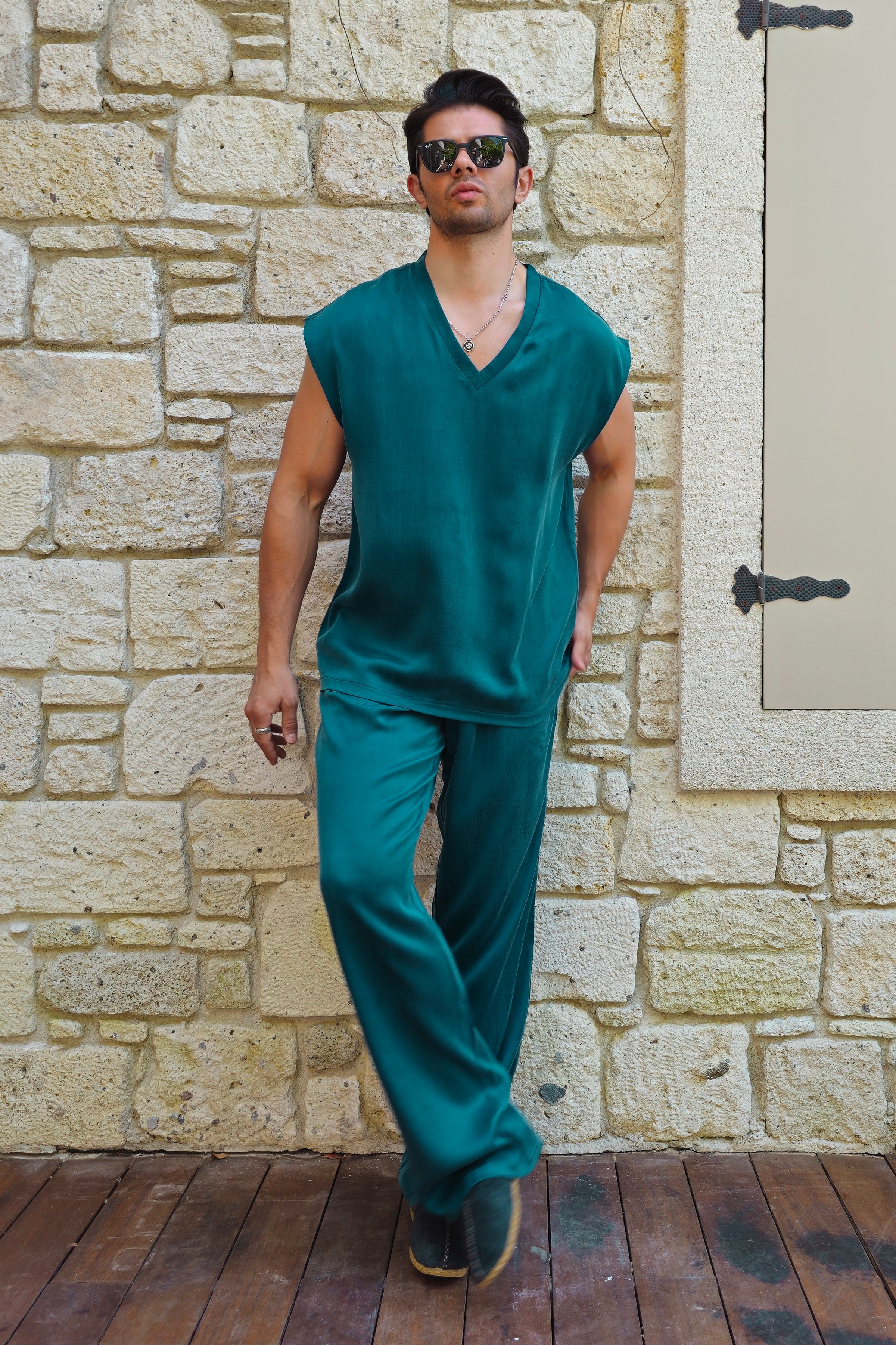 For a complete look, pair it with our Aura Pants in Teal, crafted from the same vegan-silk cupro fabric. You can find the Aura Pants here, or shop the Raven + Aura Set for an effortlessly refined ensemble.